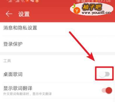 3进入配置列表,在工具选项下就能看到桌面歌词的选项,我们开启后方的开关。