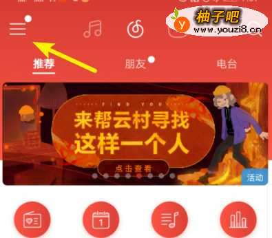 我们解锁手机进入网易云音乐后,点击左上方的三条横的图标。