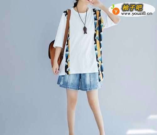 4白色圆领印花拼接宽松T恤搭配银色短裤,非常具有个性的搭配,很允许凸显出个人独特的个性,同时非常具有青春飞扬的风采。