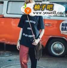2黑色字母宽松T恤搭配九分特别黑红九分裤,非常潮流的搭配,很允许挑战人们的审美标准。