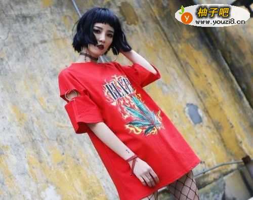 中长款红色宽松露肩T恤搭配黑色网裤,非常个性,大胆的搭配,不但允许很好的彰显出个人不羁的风采,同时显得整个人特别的帅气。