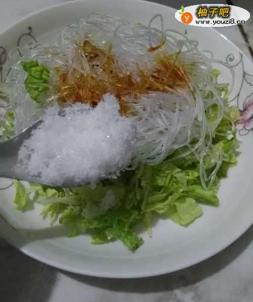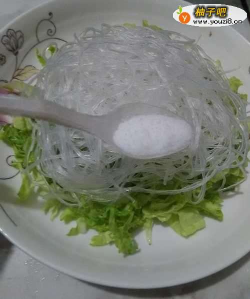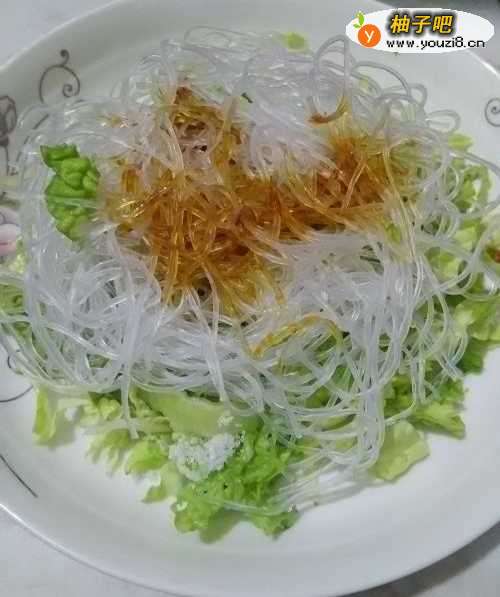 9如果喜欢吃辣,能往盘中加入少许辣椒油或辣椒粉,如果不喜欢吃辣,直接将粉丝和白菜丝拌匀,就能吃了,又酸又甜,清爽可口。