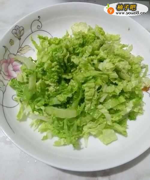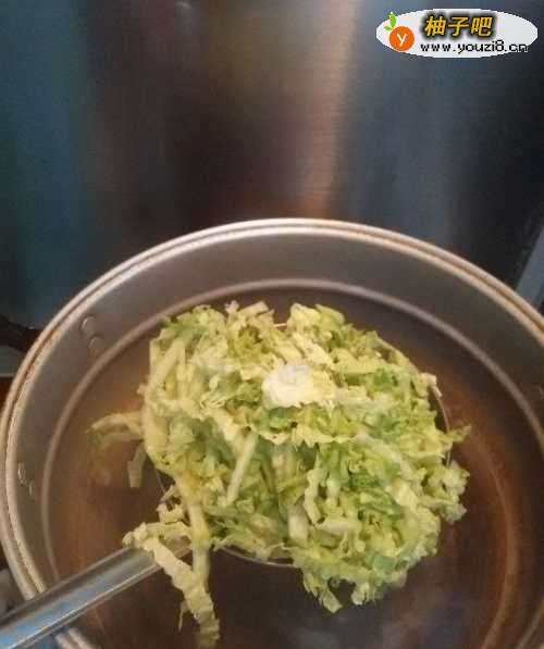 2将白菜切成均匀的丝,在锅中放入清水,水开后,将白菜丝放入锅中焯一下水,然后捞出来控干。