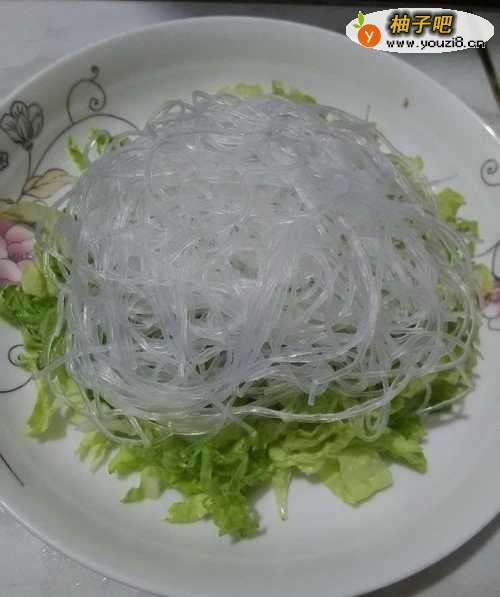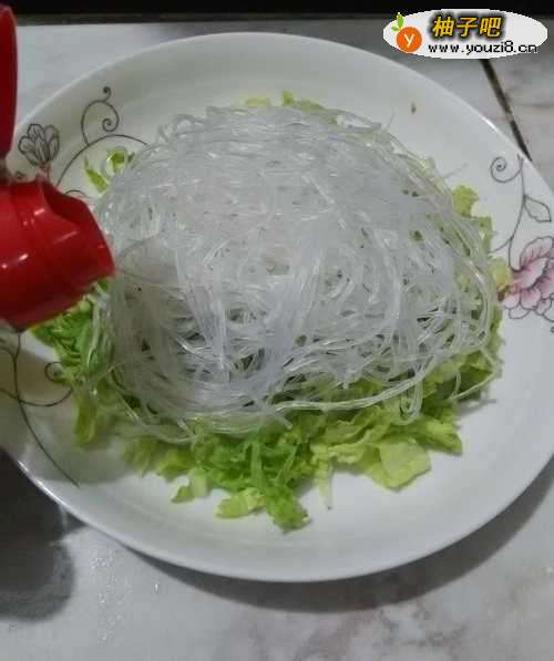 5将煮熟的粉丝放在盛白菜的盘子里面。
