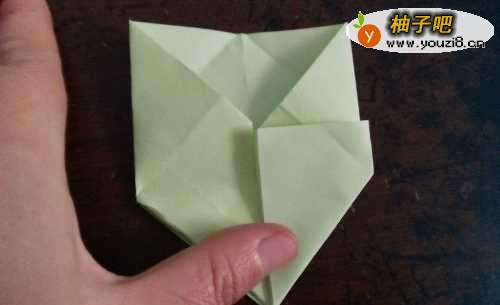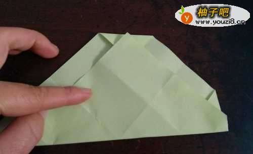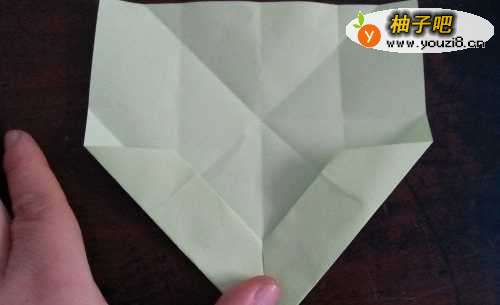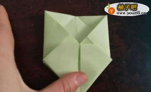 3折好后,我们把两侧的边向内折,如图一。翻到别面,按照折痕把彩纸折成图三的样子。