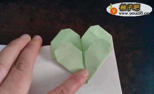 6把所有的角向内折,双心书签就做好了。图三是放在书上的效果图。