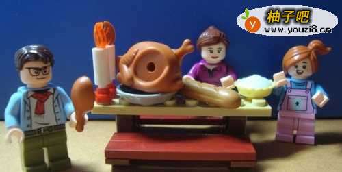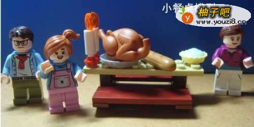 6最后,把拼装好的小餐桌模型摆放在场景中,并搭配积木人物作为场景的背景图形,如下图所示。这样小餐桌模型就搭建好了。