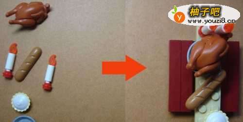 5接着,把小餐桌模型的各部件摆放在桌子上,并安装在一起。左边是拼装所需的零件,右边是拼装好后的整体结构效果,如下图所示。