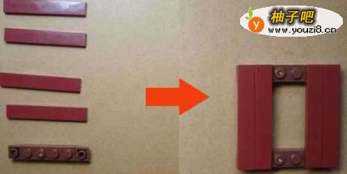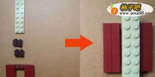 3接着,搭建小餐桌模型的桌面图形,由两个围墙积木和一个长方形积木所组成。左边是拼装所需的零件,右边是拼装好后的整体结构效果,如下图所示。