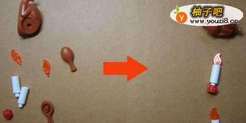4然后,搭建小餐桌模型上的蜡烛图形,由两个圆形支架形积木和零件积木所组成。左边是拼装所需的零件,右边是拼装好后的整体结构效果,如下图所示。