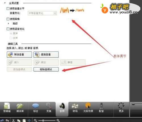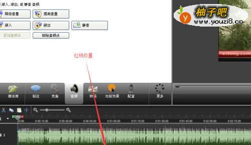 10把鼠标红线位置,按住左键,可具体调节音量大小,右击可复制,粘贴,插入音频点