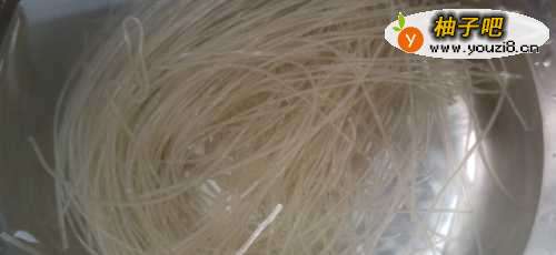 2粉丝用热水烫一下,泡软,再用清水洗净,备用。