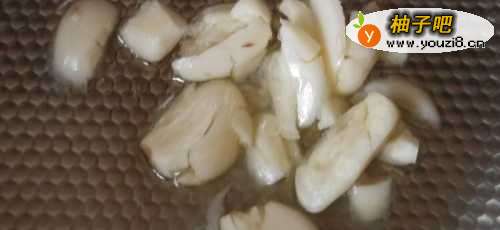 4然后开火加热锅,放入适量的色拉油,放入拍碎的蒜瓣爆炒一下。