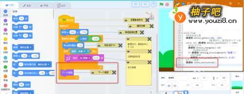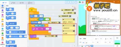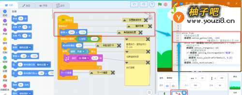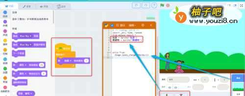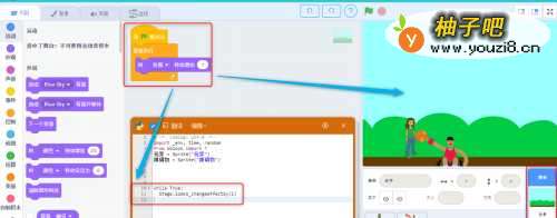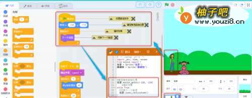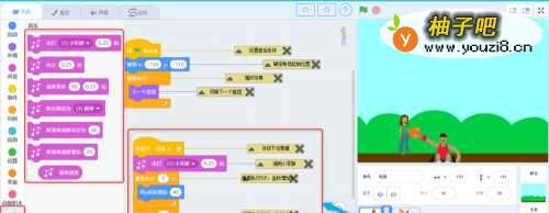 程序解读:跳障碍的小女孩子知识点:循环,侦测,控制,选择,特效,运算,音乐