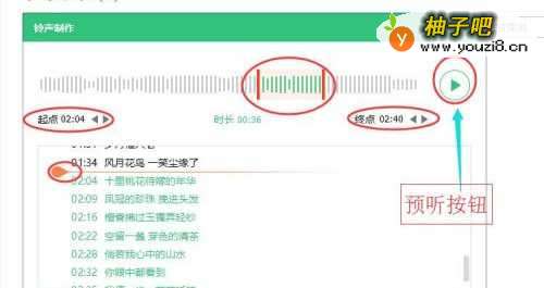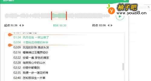 3点击播放要裁剪的音乐文件,同时启用歌词,这样方便在裁剪的时候,能清楚知道该音乐具体播放到了哪位置;