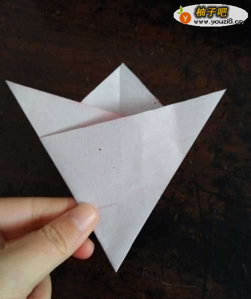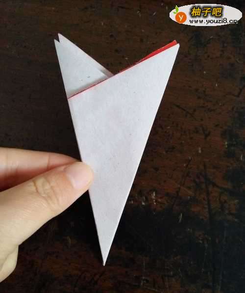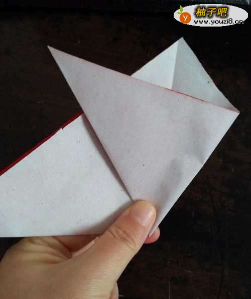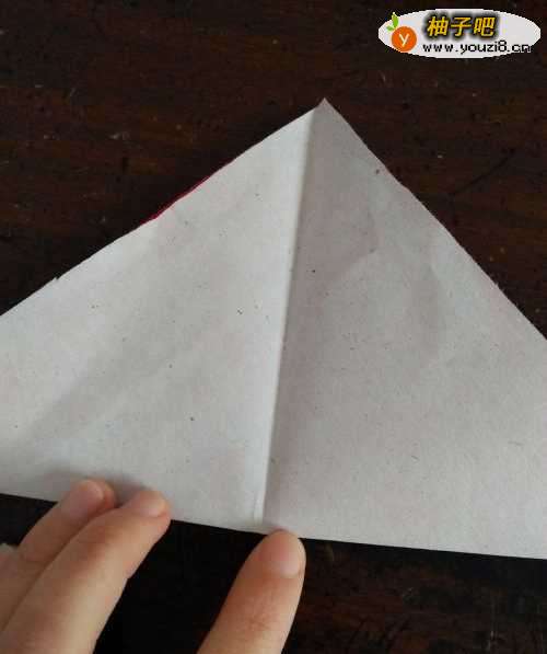 3接着再把红纸的左角向右角对折后开启,我们要底边的中点。