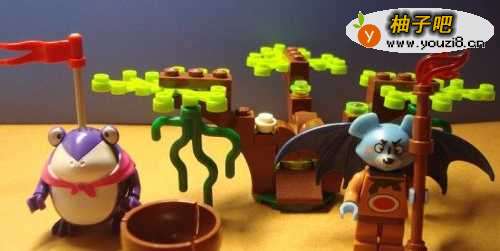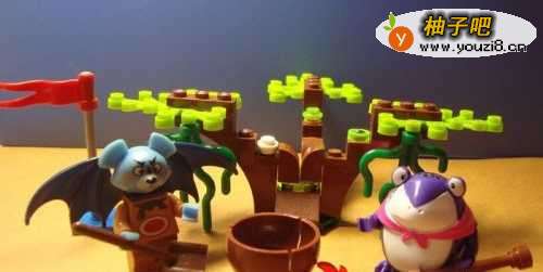 6最后,小青蛙和小蝙蝠积木配上道具,这样就表示正在快乐的聚会。这样朋友们快乐的聚会的场景就搭建好了,如下图所示。