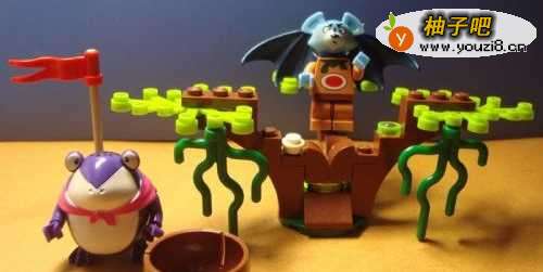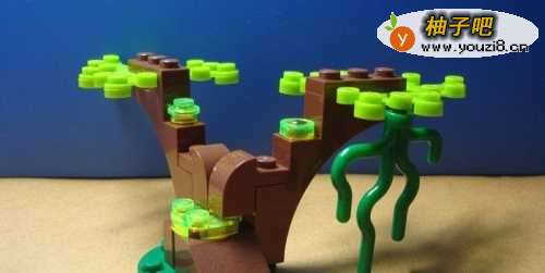5接着,找出一个小蝙蝠积木,放在大树的上边,摆放的位置,如下图所示。