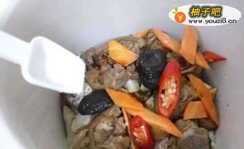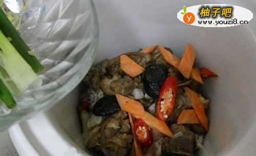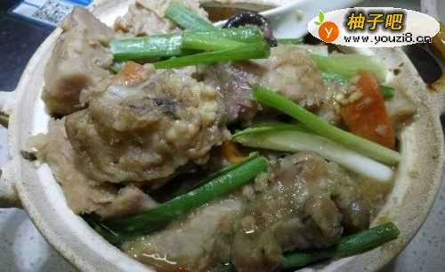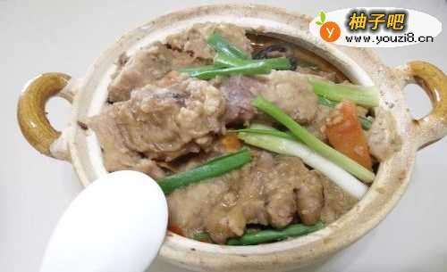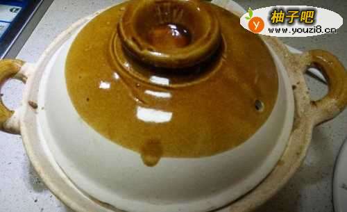 9焖熟烂后盛到砂锅中,放上葱段,盖上盖子焖一会儿。