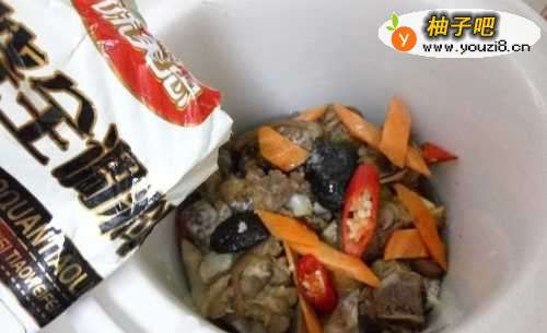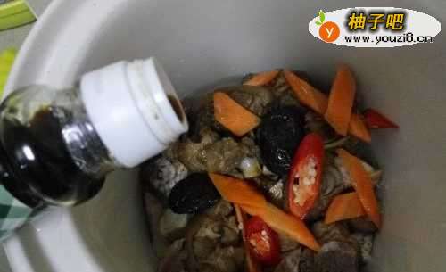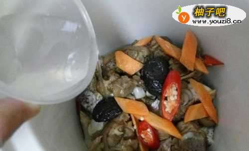 3将猪蹄和芋头,还有葱以外的配料都倒入焖锅中。