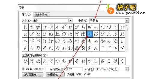 4在“子集”中选择“平假名”,并在下方选中平假名ひ,点击“插入”。