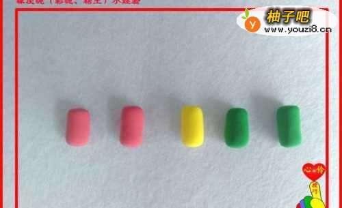 6分别取红、黄、绿色彩泥适量,制作5个短圆柱。