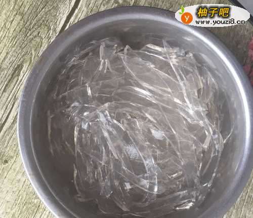 3石花膏煮好搓丝;石花膏也是四果汤的标配,就是因为石花膏,所以这个才更是特产,特产一个由来是具有地方特色,另外一个是食材就是这个地方盛产,也是在地方的人会这样吃;