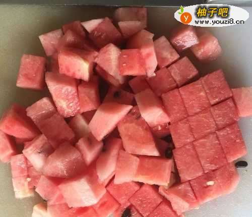 将西瓜去皮,切成小块;西瓜只是因为刚好到季节了,还能加菠萝、火龙果啊、哈密瓜啊,小编今天只准备了西瓜;