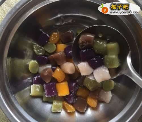 2将芋圆煮好,备好;芋圆也是标配的大类之一,还有一个东西跟芋圆长得差不多,叫做阿达子;还有我们吃的糯米丸子、很多长得差不多的,但是口感上差很多,比如芋圆有芋头的香味,阿达子比较Q弹,糯米丸子软软糯糯;