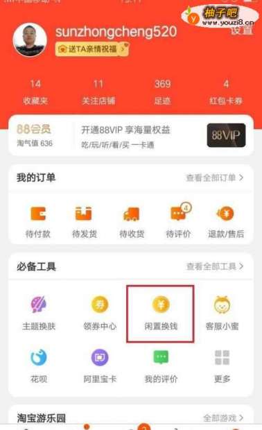 3点击“我的淘宝”,进入我的淘宝页面,在必备工具里找到“闲置换钱”。