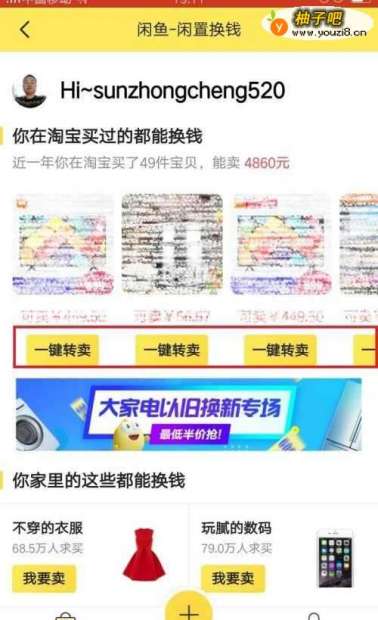 4点击“闲置换钱”,进入闲鱼-闲置换钱页面,会看到自己购买过的宝贝下方都有一个“一键转卖”。