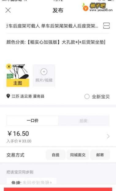 5找到自己准备转卖的宝贝,点击下面对应位置的“一键转卖”,就进入发布页面,本经验中选择的是自行车后座架,转卖界面如图。