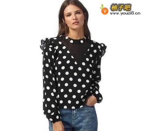 搭配三:黑色波点吊带衬衫+浅蓝色破洞牛仔裤这款黑色波点吊带衬衫是比较个性、夸张的风格,露出锁骨和颈部线条很显性感,搭配一条潮流的浅蓝色破洞牛仔裤,时髦感十足。