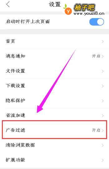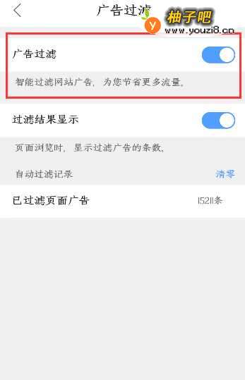 6来到过滤的的页面,将过滤后面的开关启用,就能智能过滤网页,还能节省流量呢,如图所示