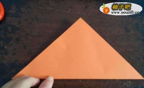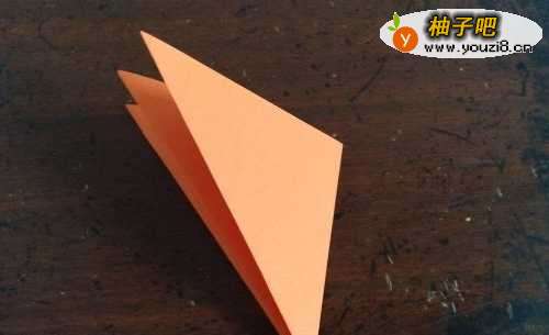 2先把彩纸的对角线对折一下,然后再左右对折,边缘线要对齐。