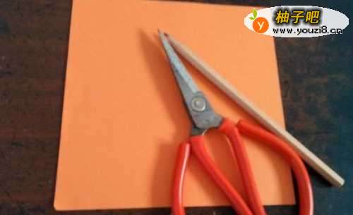 首先准备好一张正方形彩纸,一把剪刀,一支铅笔待用。