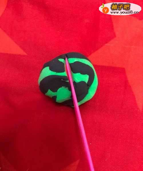 4我们用小刀把它切开,在拿出黑色的彩泥揉成4个小圆形粘到里面做西瓜籽。