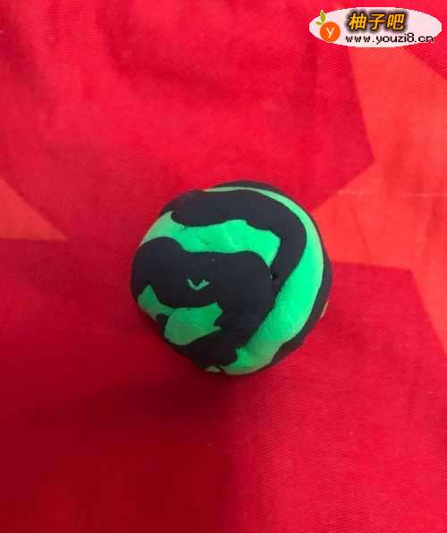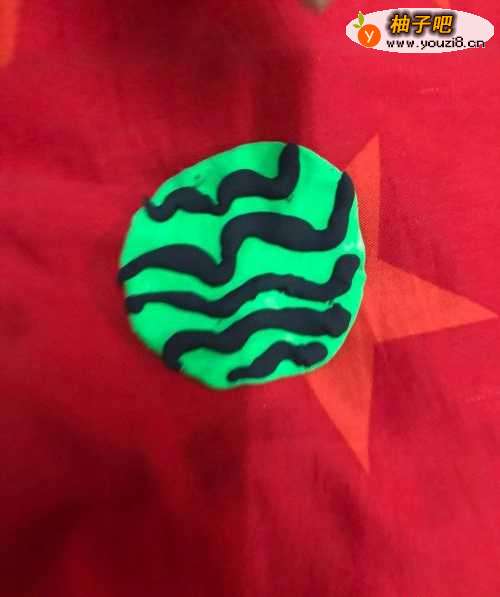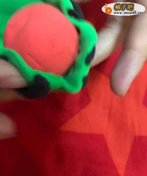 3在把红色的圆形放到绿色上面把他包起来,一个可爱的西瓜就做成拉,