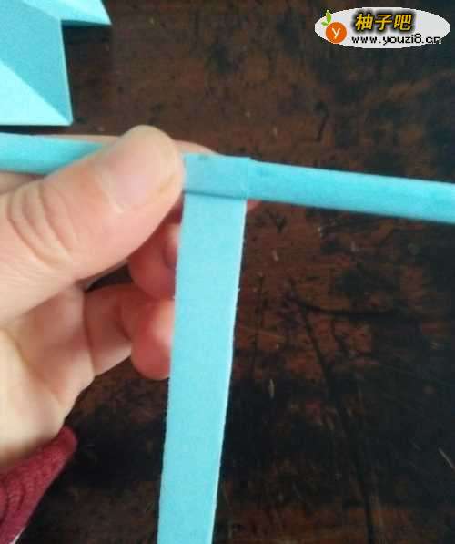 7其他的角依次同样实施,折好后,我们在取一张长方形彩纸来做手柄,把彩纸的边向上卷,卷成一条长条形。