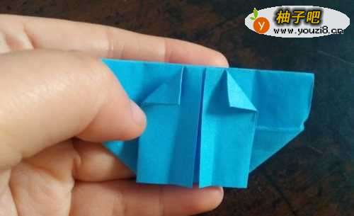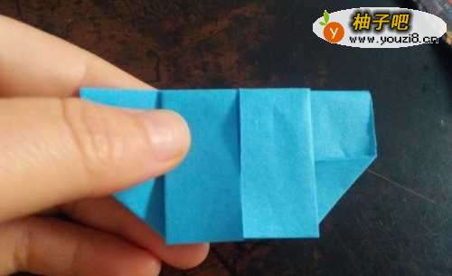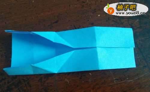 6把两侧的角向内折,按照折痕角平分,如图二。我们把这一部分向后折如图三。