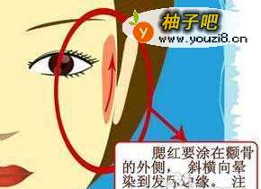在颧骨的外侧涂抹一点腮红,要斜横向晕染到发际边缘。