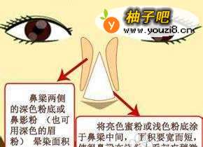 4细长的鼻子也要修整哦 在鼻梁两侧涂上点深色粉底或者鼻影粉(没有鼻影粉的MM也可用深色的眉粉代替),需要注意的是晕染面积一定要窄而短。 将亮色蜜粉或浅色粉底涂于鼻梁中间,面积要宽而短,使得鼻梁在视觉上看起来稍微宽些,并收敛长度。