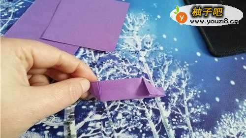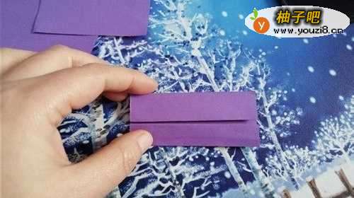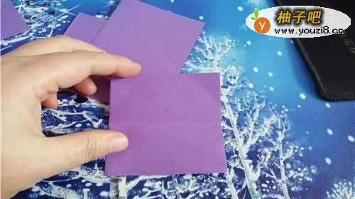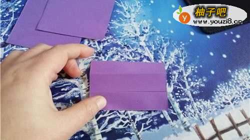首先把彩纸的中线对折,再把上下边向内折,然后启用彩纸翻到背面。