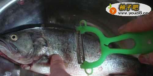 2接着,告诉孩子,用小刮刀给鲈鱼去除鱼鳞,如下图所示。