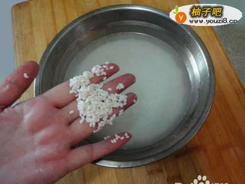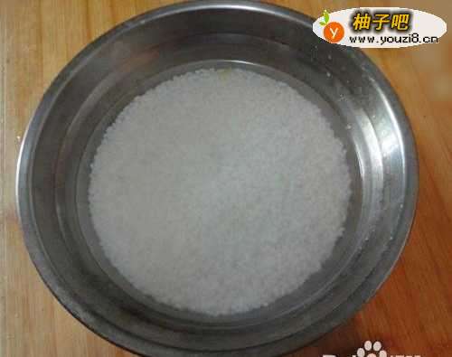 我们首先选择圆粒江米,用水洗净,泡上两个小时