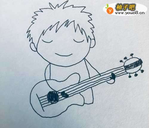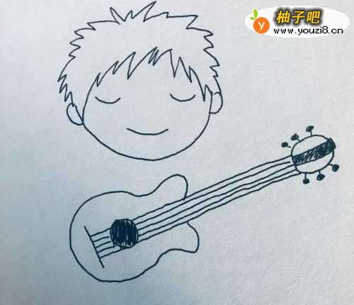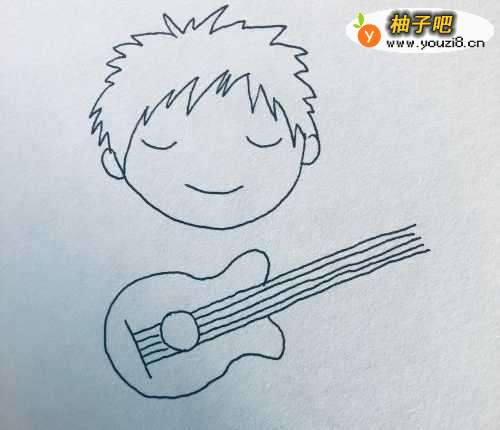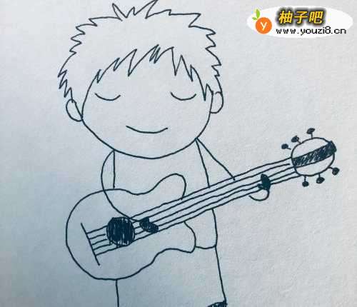 3然后绘画男生胸前抱着的吉他形状,琴弦一定是笔直的