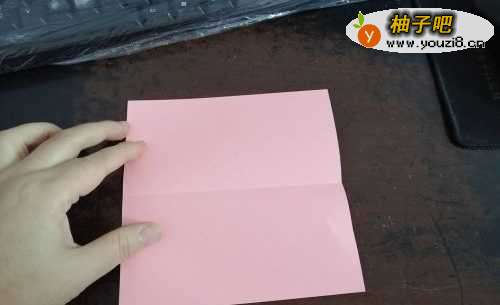 首昆各先把彩纸的上下边对折,然后把下侧的边向着折痕对折,如图。