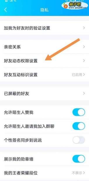 4点击开启隐私,找到好友动态权限使用。