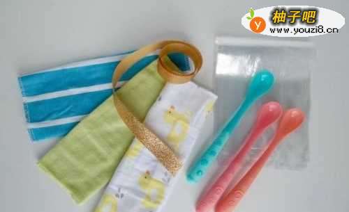 婴儿毛巾 ,宝宝用的勺子, 透明胶带,透明糖果袋,丝带
