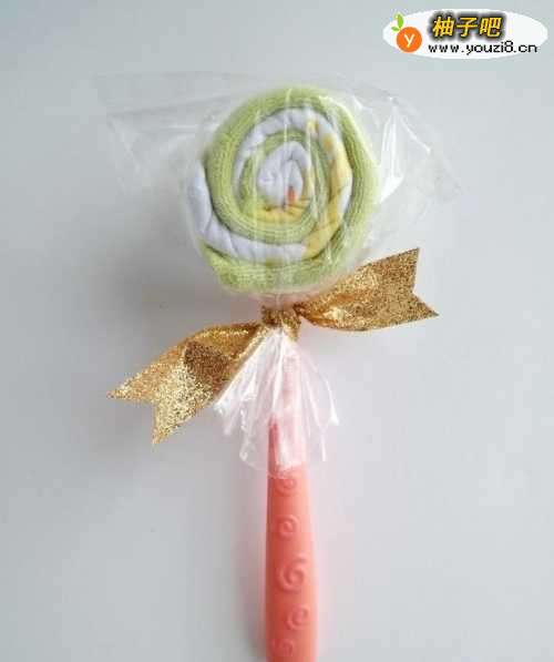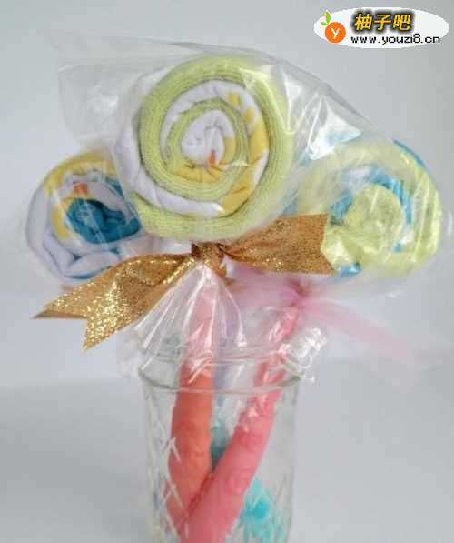 5最后,将棒棒糖放入糖果袋中,并在下边系上彩带。充满童趣的毛巾棒棒糖就完成了,能给小孩当做玩具,也能放在透明的杯子里当做家中的装饰。